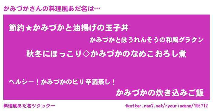 | 男性向けラノベタイトル風あだ名 | 『かみづかに滅ぼされるだけの簡単なお仕事です』 |