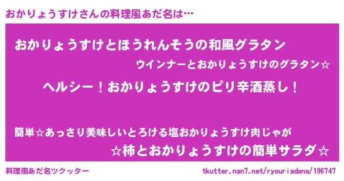 | 男性向けラノベタイトル風あだ名 | 『Re:おかりょうすけから始める異世界生活』 |