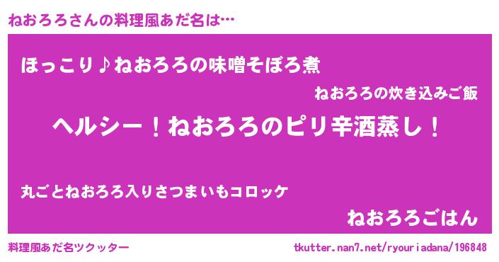 | 男性向けラノベタイトル風あだ名 | 『Re:ねおろろから始める異世界生活』 |