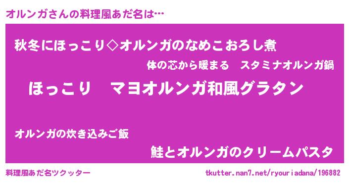 | 女子向けラノベタイトル風あだ名 | 『悪役オルンガに転生したようですが、知った事ではありません』 |