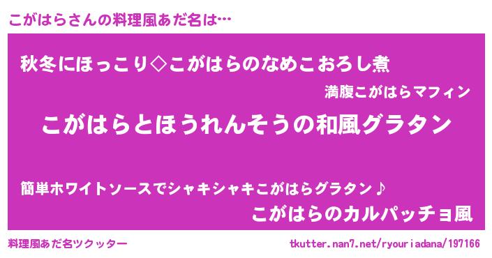 | 女子向けラノベタイトル風あだ名 | 『こがはらの玉の輿計画!』 |