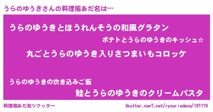 | 女子向けラノベタイトル風あだ名 | 『乙女ゲームの破滅フラグしかない悪役うらのゆうきに転生してしまった…』 |