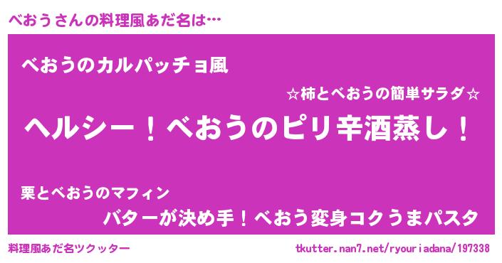 | 男性向けラノベタイトル風あだ名 | 『Re:べおうから始める異世界生活』 |