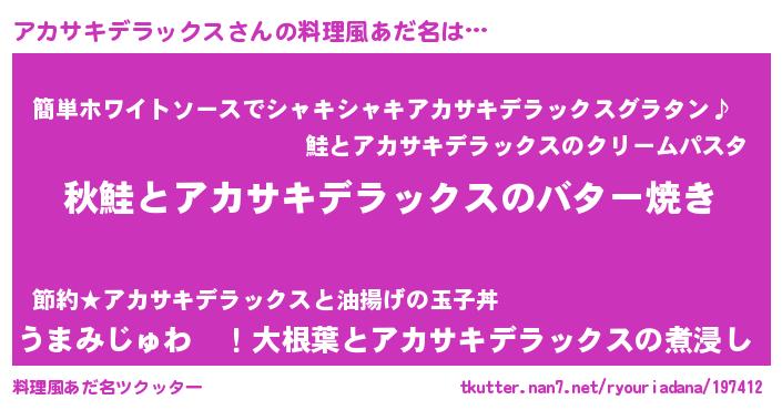 | 胡散臭い通販商品みたいなあだ名 | 『来世でも幸せになれる健康食品…その名も「アカサキデラックス」』 |