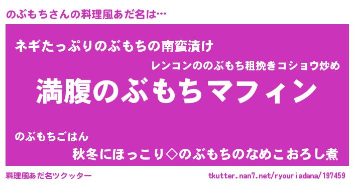 | 胡散臭い通販商品みたいなあだ名 | 『絶対に幸福をもたらす健康食品…その名も「のぶもち」』 |