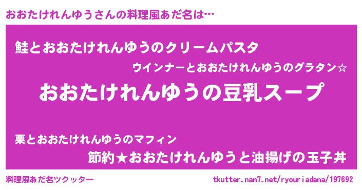 | 胡散臭い通販商品みたいなあだ名 | 『信頼と実績のサプリメント…その名も「おおたけれんゆう」』 |