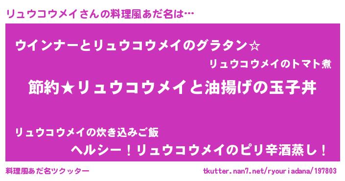 | 男性向けラノベタイトル風あだ名 | 『リュウコウメイアートオンライン』 |