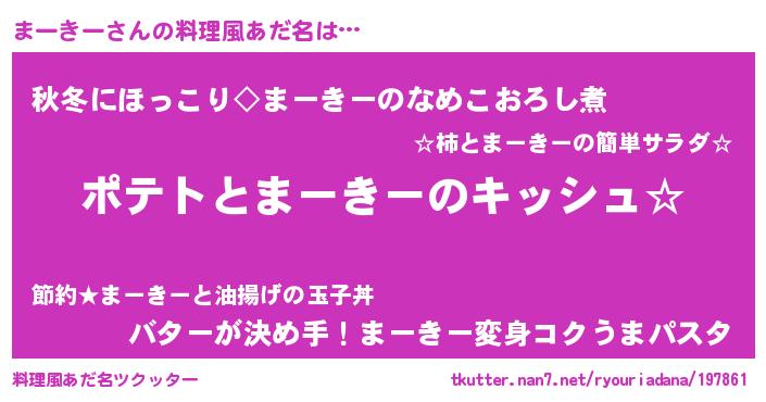 | 女子向けラノベタイトル風あだ名 | 『まーきーの卵を拾いまして』 |