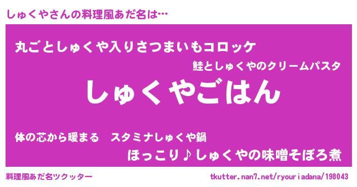 | 男性向けラノベタイトル風あだ名 | 『シュクヤスレイヤー』『しゅくやの憂鬱』 |