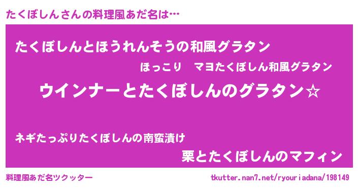 | ヘコむあだ名 | 『なまこ酢』『たくもー』『たくっぺ』 |
