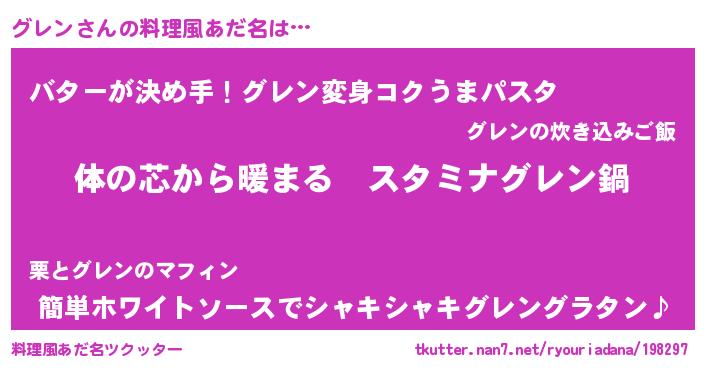 | 女子向けラノベタイトル風あだ名 | 『グレンの雑貨屋さん』『グレン恋絵巻』 |