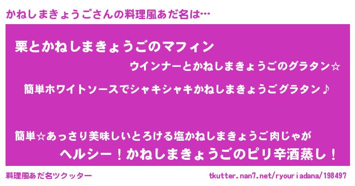 | 男性向けラノベタイトル風あだ名 | 『かねしまきょうごの嫁は女の子じゃないと思った?』 |