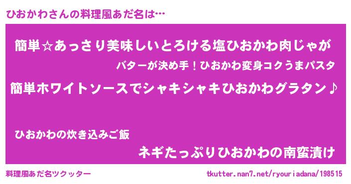 | 男性向けラノベタイトル風あだ名 | 『ひおかわの嫁は女の子じゃないと思った?』 |