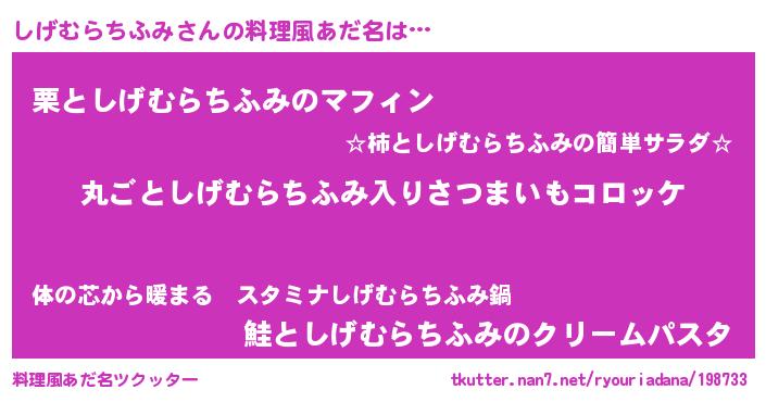 | ヘコむあだ名 | 『豆乳』『しげむらちふみ(笑)』 |