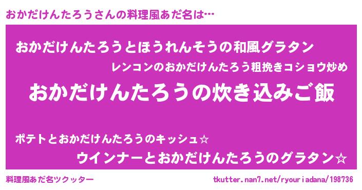 | 男性向けラノベタイトル風あだ名 | 『うちのおかだけんたろうが世界を掌握している!』 |