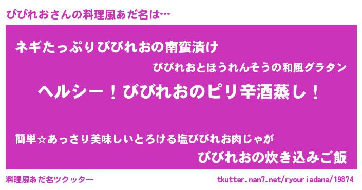 | 男性向けラノベタイトル風あだ名 | 『Re:びびれおから始める異世界生活』 |