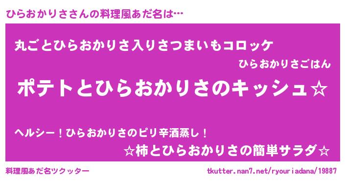 | 男性向けラノベタイトル風あだ名 | 『ひらおかりさの嫁は女の子じゃないと思った?』 |