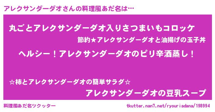 | 男性向けラノベタイトル風あだ名 | 『Re:アレクサンダーダオから始める異世界生活』 |