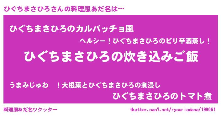 | 男性向けラノベタイトル風あだ名 | 『うちのひぐちまさひろが世界を掌握している!』 |
