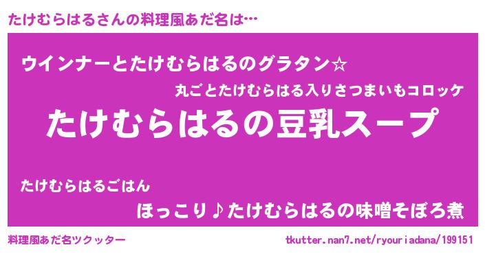 | 男性向けラノベタイトル風あだ名 | 『ダンジョンにたけむらはるを求めるのは間違っているだろうか』 |