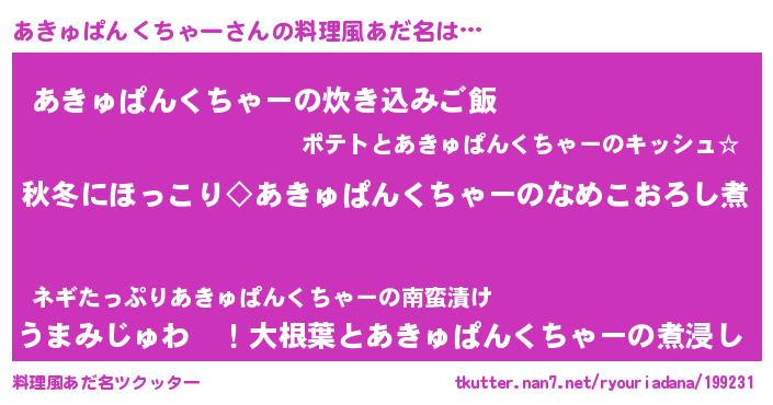 | 男性向けラノベタイトル風あだ名 | 『あきゅぱんくちゃーに滅ぼされるだけの簡単なお仕事です』 |