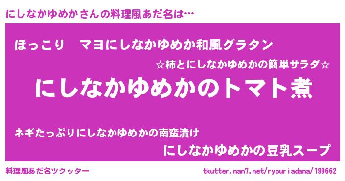 | 男性向けラノベタイトル風あだ名 | 『おまえをオタクにしてやるから、俺をにしなかゆめかにしてくれ! 』 |