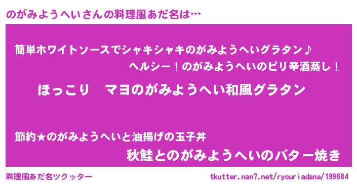 | 胡散臭い通販商品みたいなあだ名 | 『あなたにだけ特別に提供する100年もののヴィンテージワイン…その名も「のがみようへい」』 |