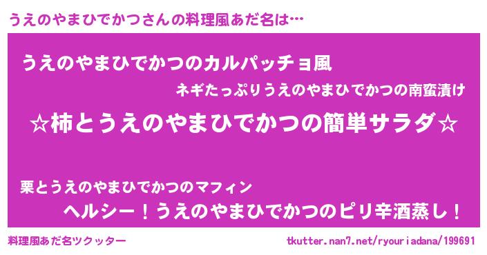 | 意味不明あだ名 | 『住所不定無職うえのやまひでかつ(47歳)』 |