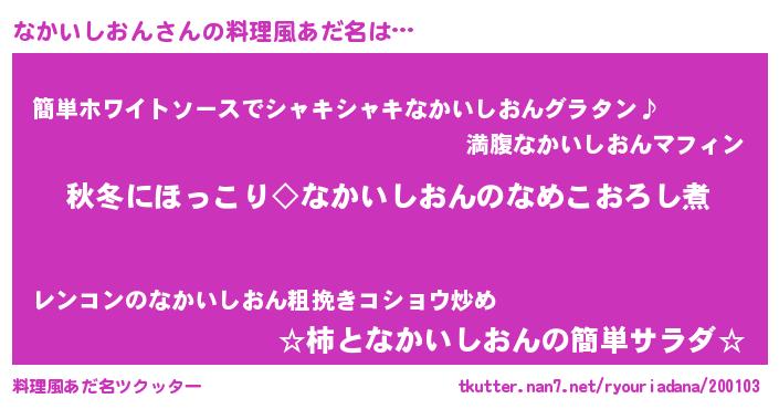 | 男性向けラノベタイトル風あだ名 | 『なかいしおんに滅ぼされるだけの簡単なお仕事です』 |