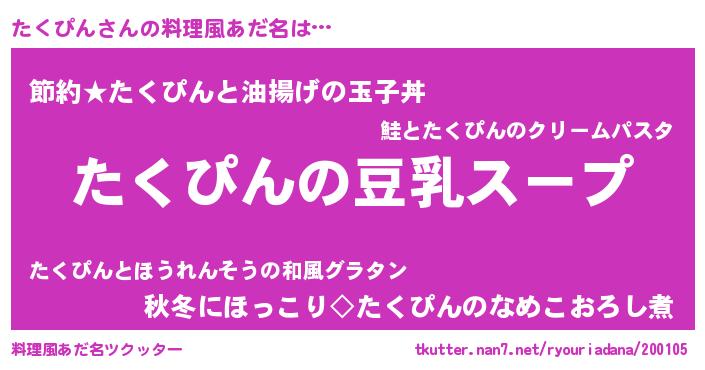 | ピコ太郎風あだ名 | 『タク史郎』『タコ八郎』『タタ太郎』 |