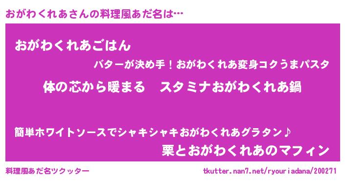 | 欧米人風あだ名 | 『おがわくれあクリステル』 |