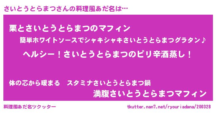 | 意味不明あだ名 | 『自称さいとうとらまつ』 |