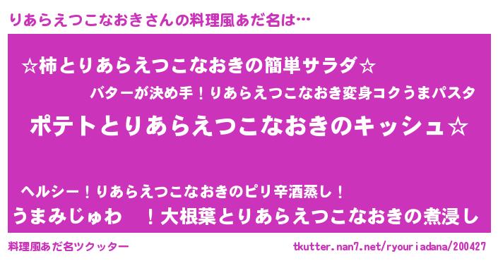 | 女子向けラノベタイトル風あだ名 | 『りあらえつこなおきの卵を拾いまして』 |