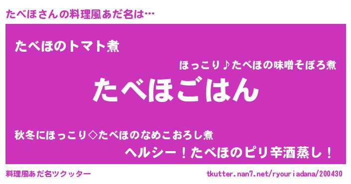| 男性向けラノベタイトル風あだ名 | 『タベホスレイヤー』『たべほの憂鬱』 |