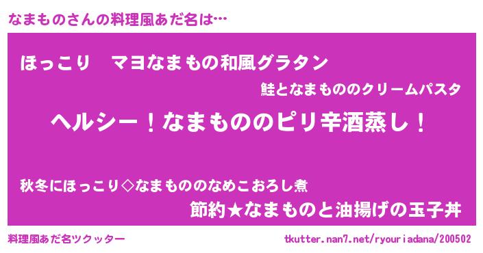| 意味不明あだ名 | 『自称なまもの』『ペロリンなまもの』 |
