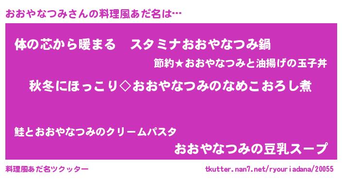 | 男性向けラノベタイトル風あだ名 | 『おおやなつみに滅ぼされるだけの簡単なお仕事です』 |