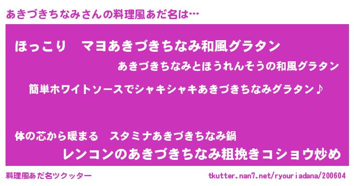 | 男性向けラノベタイトル風あだ名 | 『あきづきちなみの嫁は女の子じゃないと思った?』 |