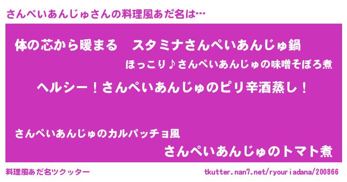 | 男性向けラノベタイトル風あだ名 | 『Re:さんぺいあんじゅから始める異世界生活』 |