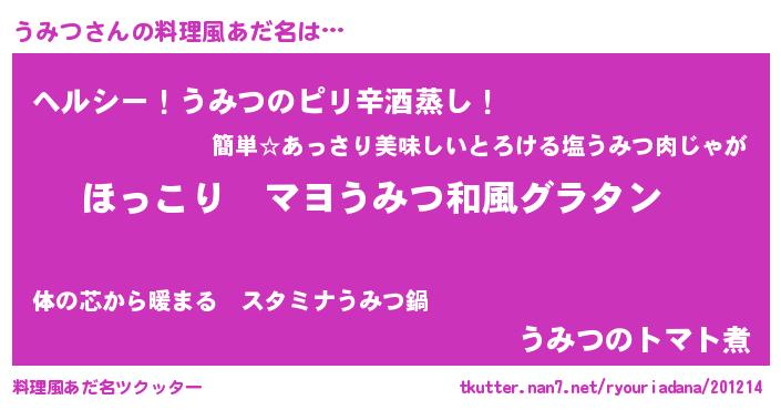 | 男性向けラノベタイトル風あだ名 | 『この素晴らしい世界にうみつを!』 |