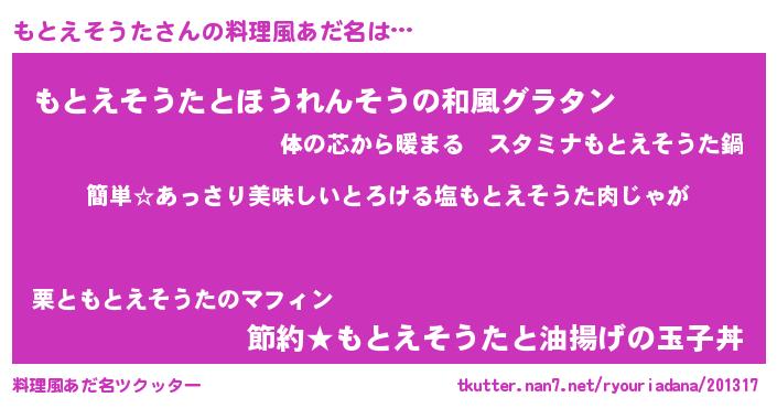 | 胡散臭い通販商品みたいなあだ名 | 『前代未聞の健康食品…その名も「もとえそうた」』 |
