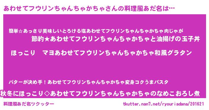 | 女子向けラノベタイトル風あだ名 | 『悪役あわせてフウリンちゃんちゃかちゃに転生したようですが、知った事ではありません』 |