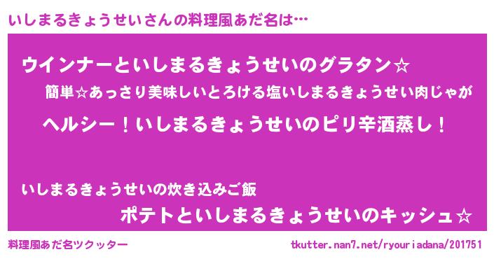 | 男性向けラノベタイトル風あだ名 | 『Re:いしまるきょうせいから始める異世界生活』 |