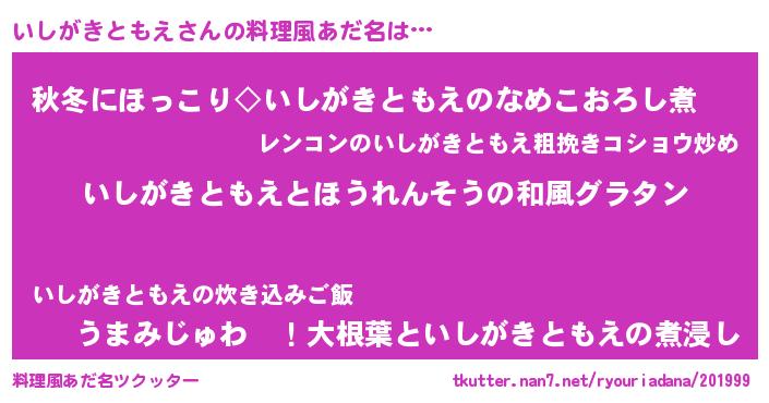 | 胡散臭い通販商品みたいなあだ名 | 『運命の人と巡り会える高級そうな皿…その名も「いしがきともえ」』 |