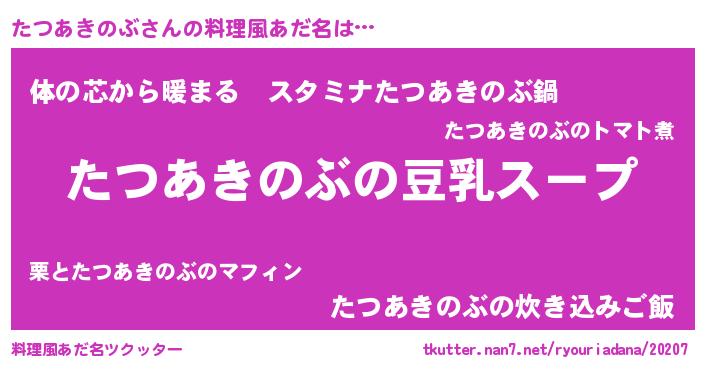 | 女子向けラノベタイトル風あだ名 | 『たつあきのぶは平凡を望む』 |