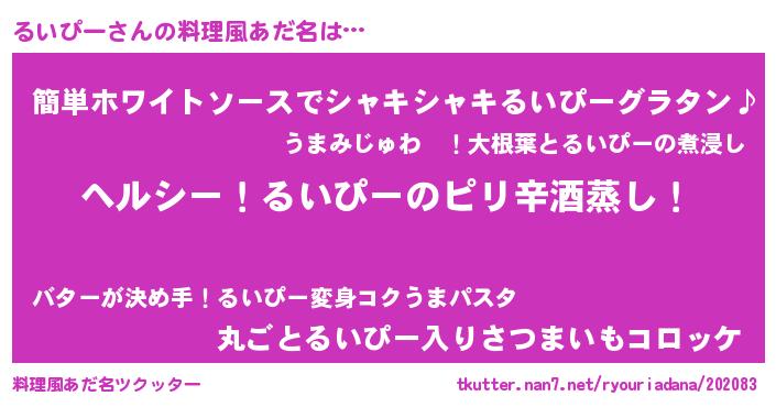 | 男性向けラノベタイトル風あだ名 | 『Re:るいぴーから始める異世界生活』 |