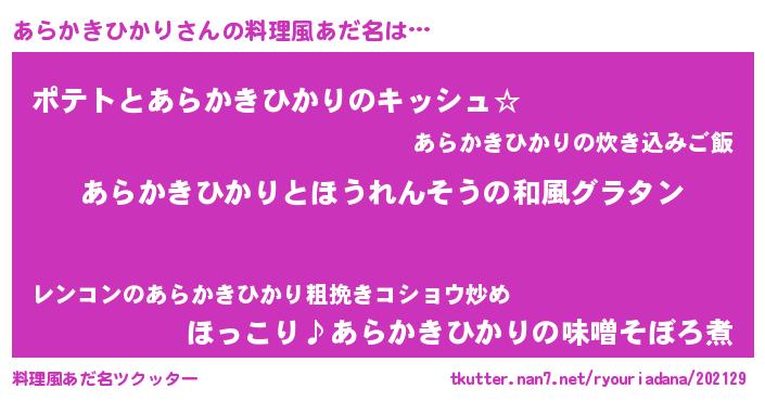 | ポケモン風あだ名 | 『アラキング』『ヒアラカキヒカリ』 |