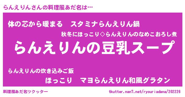 | 胡散臭い通販商品みたいなあだ名 | 『信頼と実績のサプリメント…その名も「らんえりん」』 |