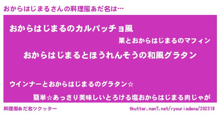 | 男性向けラノベタイトル風あだ名 | 『転生したらおからはじまるだった件』 |
