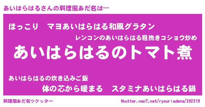 | 女子向けラノベタイトル風あだ名 | 『あいはらはる夫妻のなれそめ』 |