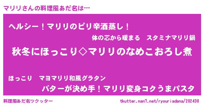 | ヘコむあだ名 | 『酢こんぶ』『マリリ(震え声)』 |